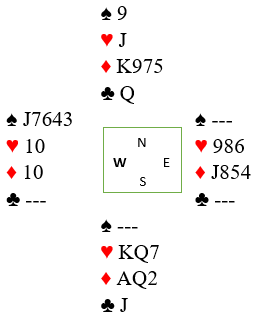 Idet spillefører fikk for spar 10 var det kun en trumf igjen og N/S kunne ikke få mer enn for den og ett stikk i hjerter. Men hva om nord stikker vests spar knekt/10 med damen? Dette er igjen idet nord er inne på spar dame: