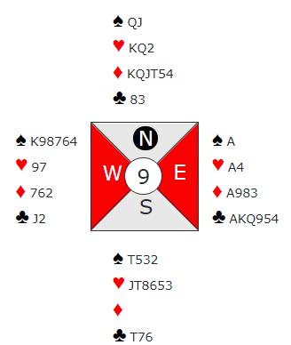 Der Sofie Græsholt Sjødal satt nord og åpnet med 1NT kom den sjeldne innmeldingen 3NT fra øst! Syd, Sofies mor Elisabeth sa 4 hjerter. Nå visste ikke Sofie sikkert om det viste hjerter eller om det var overføring til spar. Men hun passet, og tenkte at hvis det går pass rundt og syd har spar så kan det kanskje være en bra stamp uansett hvor mange udoblede bet syd går. Og om de dobler kan syd ta ut hvis hun mente 4 hjerter som overføring til spar.