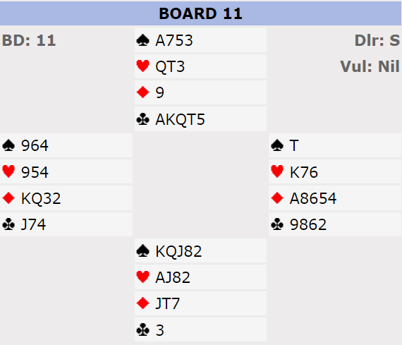 Da spillet forekom så jeg på en spiller som måtte ha talt opp stikkene sine feil. Hun fulgte på en måte den siste planen, men tok ikke de to siste trumfene. Så den mulige skvisen var ikke gjennomført. I stedet ble det sagt "claim" (forlangte resten), men det er jo feil for på det tispunktet var det kun elleve sikre stikk! Så da (etter misclaim) får man ikke gjennomføre noen skvis lenger og må spille kløveren fra topp. Den eneste sjansen i et spill med så mange sjanser ble pluteslig at kløver knekt faller. Og bridgegudene var velvillige: