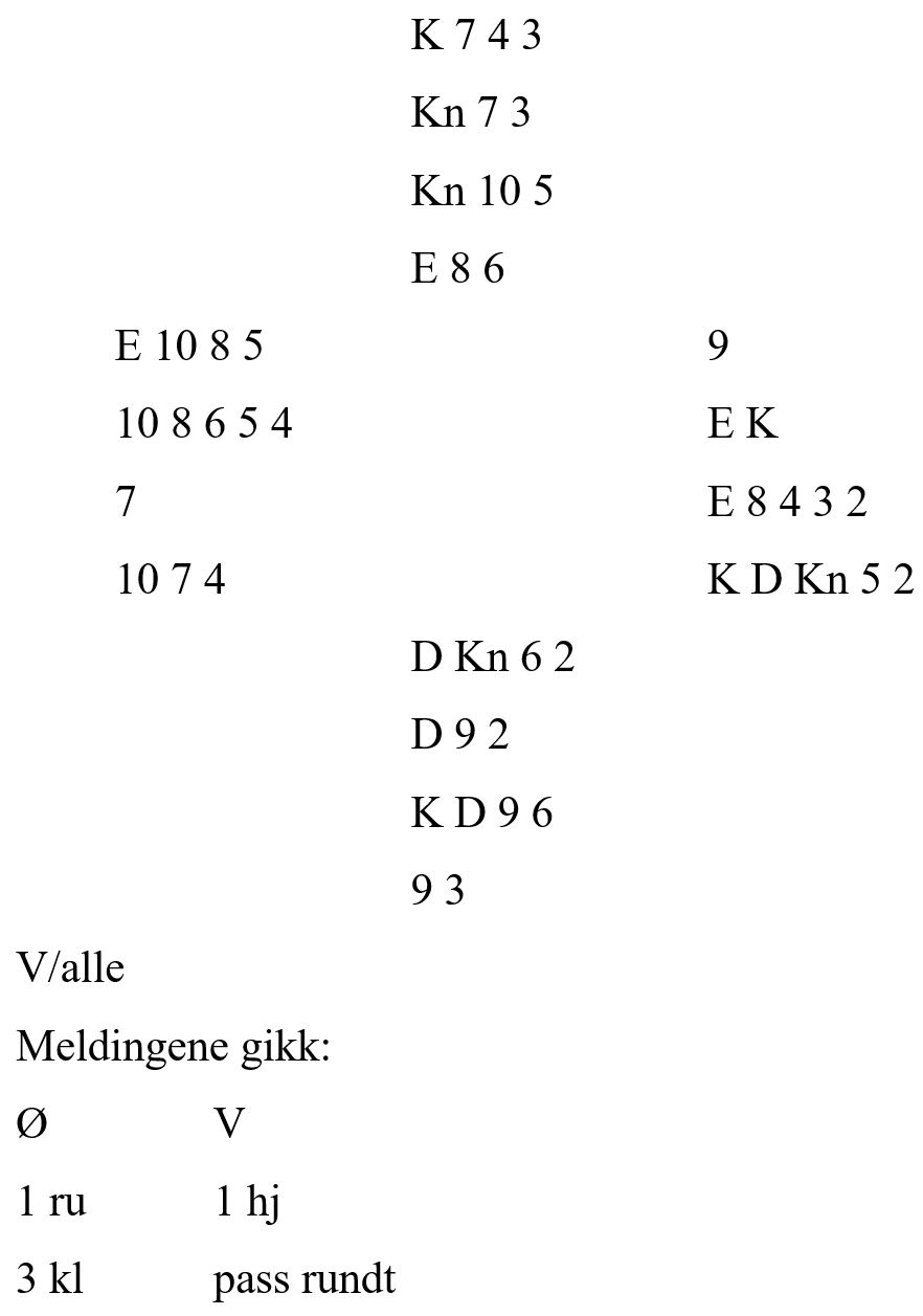 I andre stikk spar knekt. Om syd har bare esset legger han kanskje liten. Da tas kongen fulgt av A-K i kløver med sparavkast, og det ville sett lysere ut. Men syd stakk med spar ess, og nord la spar 9 (svensk fordeling). Syd spilte så liten spar. Den kunne jeg latt løpe til tieren, men turte ikke det, og tenkte nok også på at om syd har spar dame burde han vel ha klart å spille den siden han visste jeg hadde en spar igjen. Spar konge vant det stikket. Så spar til stjeling, ruter til stjeling, A-K i kløver og enda en spar fra bordet. Nord kastet en ruter, og den fjerde sparen ble stjålet. Så enda en ruter til stjeling, og dette var igjen med åtte stikk i lomma: