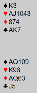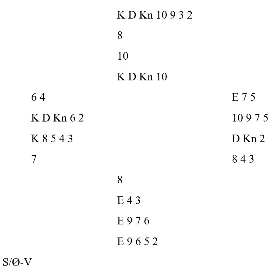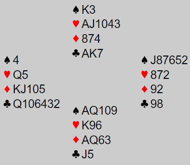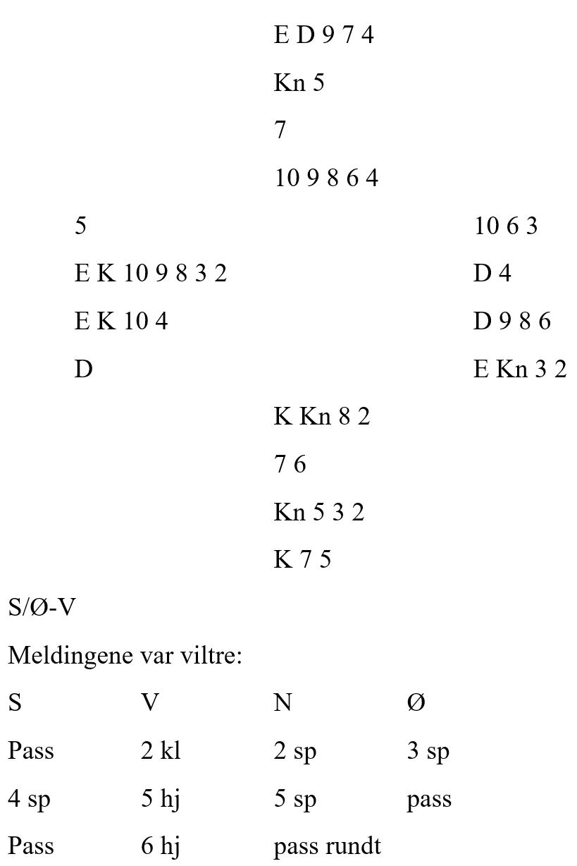 Syd åpnet med 1 kløver, og hele spørsmålet for Nord er nå om makker har tre ess eller ikke. 12 av 13 Nordspillere tok ikke sjansen på å finne ut om de tre essene var til stede, av frykt for at makker kanskje kunne ha bare ett, slik at det kunne bli bet i 5 spar. Syd hadde ikke et eneste bortkastet kort i form av en knekt, dame eller konge, og resultatet ble 480 ved 11 av de 12 bordene( ett par endte i 5 kløver).