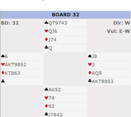 Øst åpner med 1 hjerter og Vest som har 5 honørstikk (i «gamle dager» ble det brukt som mål for å telle opp sine sikre stikk der A=1, K= 0,5, AK= 2 osv) men i moderne meldeteknikk er ny farge minst krav for gjenmelding fra makker. Tone Annette i Vest svarte derfor bare 2 kløver og jeg gjenmeldte 2 hjerter, nå oftest 6+. Deretter satset makker med 4 NT- spm i hjerter men fikk bare 5 ruter (1 av de 5 «essene») men så avslutter vel dere ogå med 6 hjerter? Der gjorde vi også. Spar kom ut til bordets konge. Trumfbehandlingen er essensiell her. De fleste spiller hj 5 og tar finesse med damen men Syd har kongen. Etter kryss etterpå til kløver A i bordet kommer hj 5 men Nord er utsolgt! 1 bet er uunngåelig, men lilleslem har ca 75% sjansee. Bere ett par fikk bremset i 4 hjerter som ga topp. 6 NT her var et dårlig valg for det endte opp med betelass etter sparutspill og fortsettelse der. -4. Syd hadde hj KJ2 og det holdt til å bete oss.