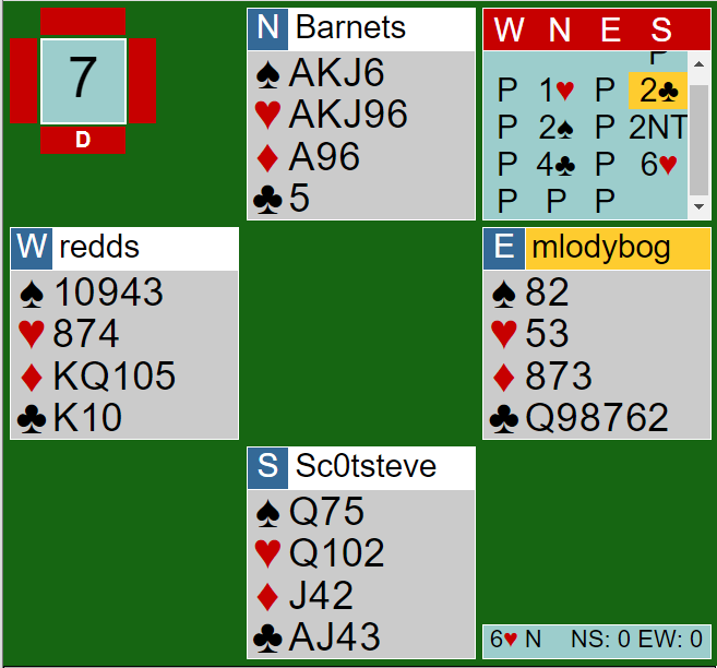 Slemmen var knallhard, men siden det satt snilt var det ingen problemer i 6 ruter. Makker stjal god hjerteren, og både trumfen og hjerteren satt fint. Det ble kun en spartaper.
