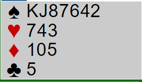 Da jeg sa 6 kløver meldte makker 6 ruter, og jeg måtte passe. Det behøver ikke være så galt, spesielt om hun har noe så ekstremt som 6-6 fordeling. Slik så hele spillet ut: