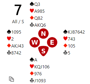 Vi fikk enkel prøve, for etter svar 1 spar fra meg hoppet Terje til 3 hjerter. Det viser sterk hånd med meget lang farge. Jeg trengte ikke mer da, gikk på med 4 NT og da svaret 5 hj hom som lover to  keycard og her er det sikkert AK i hjerter, var saken klar.5 NT bekrefter 5 ess, er storeslemsforsøk og makkers 2 konger gjør at vi da kan melde 7 hjerter! Det gjorde Solli, men så kom jo kuleramma fram for opptelling av stikk, og 13- grensen ble trygt passert så 7 NT kunne spikres. Bare ett borzd til var der mens et anndet stoppet i 7 hjerter. Klarte dere å melde storeslem og også i grand?