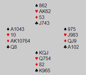 Ved det ene bordet i mix-kampen sa vest 2 ruter i denne situasjonen, og det virker vel nokså normalt. Ved begge bordene i veteranfinalen ble 2 ruter også valget, og ved de tre bordene gikk altså meldingen slik: