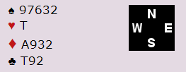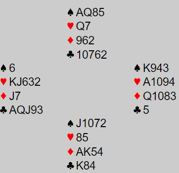 Ved det andre bordet ble det enda verre da øst ikke støttet med det samme (cue raise etter 2 hjerter inn), og vest ikke trodde spillet så slik ut. Så da N/S var i 6 hjerter doblet de og lot dem spille 6 hjerter.