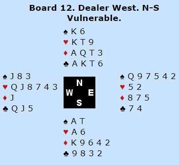 Vellykket operasjon får en si, men den dårlige nyheten var at siden ruteren satt 4-0 ble det til slutt en doblet bet i 2 hjerter, -100. Den gode nyheten var at N/S kunne vinne 6 kløver!