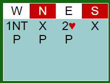 Øst åpnet med 2 hjerter og Gunn Tove Vist doblet. Torild Heskje hadde en litt vanskelig melding nå, og denne situasjonen ble etter runden diskutert av mange par.