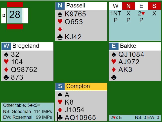 Ved det andre bordet var det norske parets lagkamerater i 5 kløver doblet som N/S og vant 12 stikk, og 12 IMP inn!