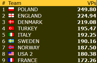 Norge har 147,38 VP etter 16 av 23 runder, og ligger foreløpig på 18.plass blant de 24 lagene. Avstanden opp til åttendeplassen er drøyt 32 vinnerpoeng, nøayktig det samme som den var etter gårdagens kamper. Vi får håpe poengsankinga blir stor i løpet av lørdagens fire kamper!