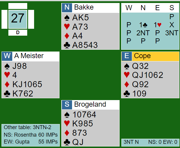 Ved det andre bordet skjedde noe svært uvanlig på dette nivået. Jeg forutsetter at rapporteringen på BBO er riktig, og i så fall mistet spillefører konsentrasjonen fullstendig. Han fikk også hjerter dame ut til esset mot 3NT, og spilte kløver til nieren, damen og kongen. Idet spillefører kom inn igjen på ruter ess tok han for kløver knekt, spilte seg hjem på spar ess og tok for kløver ess. Da øst ikke fulgte farge trodde spillefører at vest hadde stopper med sin fjerde kløver. Han hadde altså ikke fulgt med på at østs to kløvere var nieren og tieren slik at åtteren var størts! Så med 8-5-4 igjen spilte han fireren, og vest vant for singel syver. Han tok sine ruterstikk, to bet og 11 IMP til ROSENTHAL.