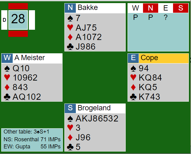 Skal en være ærlig så det ut som et butt-spill, eller trolig 1 IMP inn pga. av overstikket. Men syd har jo kun 6 poeng, så det er ikke sikkert de kommer ut i utgang ved det andre bordet. Bedre kan jo ikke det norske paret gjøre det på dette spillet, så en kan jo håpe.