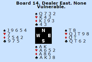 Makker kunne åpnet med 1 ru men var tynn. Da jeg fikk greie på at makker hadde nær åpning måtte hun ha noe bra i hjerter for å kunne svare min åpning med ny farge på 2-trinnet. Da våget jeg å ise 18-19 Hp med 3 NT og makkers løft til 4 NT ble oppfattet som kvantitativt. Derfor 6 NT som ble kontrakt.