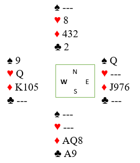 Fordelingen kan være litt annerledes, men forutsetningen er altså at øst har K-Q i ruter.