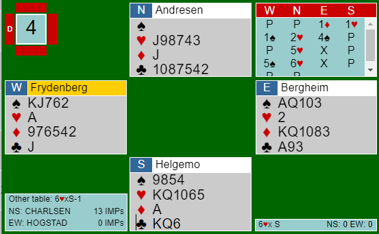 Det skal sies at Andresen tok det igjen senere, han meldte både 5 og 6 hjerter selv! Hva han ville gjort om motparten meldte 6 spar får vi aldri vite…