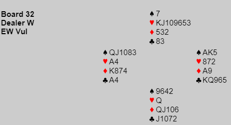 Slik det gikk ble det altså 6 hjerter doblet ved det bordet også, +200 til Ø/V ved begge bord og et av disse "kjedelige", uavgjorte spillene...