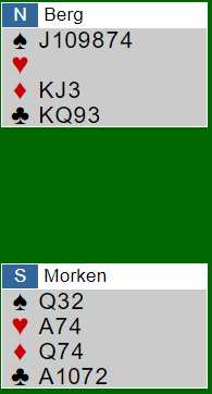 Det tok ikke mange skunder før Kristoffersen spilte ut ruter 3, et utspill en norgesmester verdig. Argumentet for et så offensivt utspill fra K-J-x mot en slem er at den hjerterfargen som kommer til å dukke opp hos nord er en stor trussel. Om ikke forsvaret får tak i stikk raskt vil antagelig tapere forsvinne fra syds hånd på nords hjerterfarge. Slik så hele spillet ut: