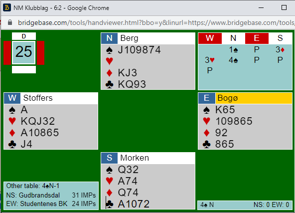 Ved det andre bordet var Klepp sitt Ø/V par også med til 4 spar, men de fikk spille den kontrakten doblet. Det ser ikke så verst ut med hensyn til antall tapere, men med den skjeve trumfsitsen ble det litt for tungt, og det endte med hele tre doblede bet, Studentenes BK 3 +500, og 11 IMP til gullvinnerne. Likevel vant Klepp 1 den siste kampen, men bare med 2 IMP.