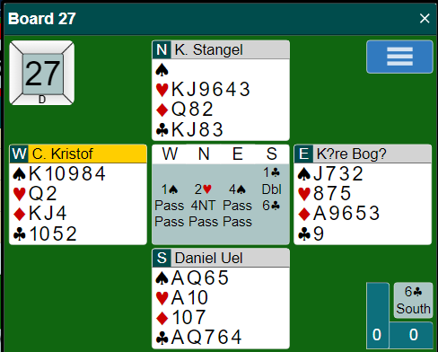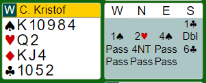 Problemet er at det kan være et rutervalg for å vinne tretten stikk om øst har esset tredje i fargen. Noen har system for å finne ut slikt, ny farge på seks-trinnet spør om tredje rundes kontroll, dvs. damen eller dobbelton. Om øst har det er storeslem en bra sjanse, men øst kan jo ha fire spar uten kongen, og i så fall må antagelig ruteren gå for fem stikk om det skal bli nok avkast. Slik så hele spillet ut: