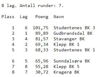 Selv om Studentenes BK slakket litt av på farten mot slutten av lagfinalen ble det i grunnen en parademarsj. Før siste kamp var det kun teori som kunne fravriste dem gull, og selv om det suverene lederlaget lå litt under mot Klepp 1 etter første halvrunde hadde ledelsen til nr. 2 økt da nærmeste utfordrer Stavanger BK lå mer under i sin kamp. Og selv om det ble tap i de to siste kampene for årets norgesmestre vant de lagfinalen overlegent. Marginen til. nr. 2 ble til slutt 12,7 VP, og vinnerlaget hadde 12,71 VP i snitt per kamp.