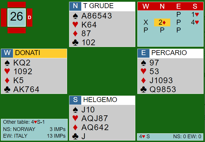 Åpningen var svake 2 og overmelding 3 spar fra Hans Petter viste to-fargehånd med hjerter+ minor. Da Tom fikk vist begge minorene var det klart at han også hadde en viss styrke og Stavrum var sterkt i tvil om storeslem eller bare lille<slem skulle meldes.