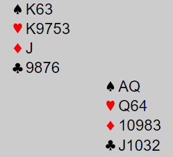 Det gikk tre ganger pass før Gorm Norstad i Øst åpnet med 1 kløver, 2+, og Syd gjentok sin pass før Arild Lysaker (V) svarte 1 ruter og Nord passet. Hva synes du øst nå bør melde, 16 hp er ganske mye og normalt har makker en del verdier siden motparten ikke blander seg inn i major på 1- trinnet. Men hva er mulige gjenmeldinger her? Med bare singel liten spar er grandbud nokså sjansebetonet, støtten im ruter er god og med den fargen som trumf er hånden verd 18 poeng inkludert fordeling for kortfarge. Da vilm kanskje hopp til 3 ruter som invitt være noe for beskjedent?