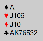Igjeen een veeldig skje<vv fordeling meed god hjerterfarge og sak 5- kort kløver sidefarge.Meen gar makker i Vest en litten tilpasning i kløver vil utgang fort stå og som iforrige, dett gjelder å sperre motparten hvis de har bra kort den veien. Jeg valgte derfor å åpne med 4 hjerter som kjøpte kontrakten. nOg da trumfen satt greitt ar det bare behandlingen i kløver som avgjorde antall stikk. Spill på kl A i Syd ga 10 stikk, men spiller man på kl D i Syd blir det 1 stikk. Kl Dx i Syd.