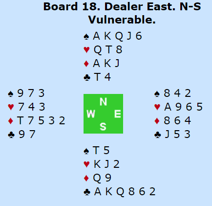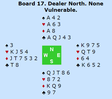 Sverre Johnsen- svarte 2 kløver da Bjørg åpnet med 1 NT. Da svaret 2 hjerter kom kunne han simpelt hen gå løs med kontrollspørsmål, fikk vite at essene og hj D var på plass men valgte å avslutte med 6 hjerter da 13 stikk «fra taket» ikke var opplagt å se. Syd kan ha taper i spar.