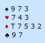 Mot 6 hjerter spilte Kjell Aadahl ut sp 5 og det så greitt ut å vinne. Men da trumf A og D etter sp A ble trukket var Jan Thore Karlsen i Øst med 10xxx med å lage problemer. Hvordan ville du løst dem, du rensker jo deg selv for trumf hvis du trekker 4 runder trumf? 3 par var in6 hjertrer, bare Jan Erik klarte seg, og av 4 andre i utgang var det bare ett som klarte å få 12 stikk i 4-5 hjerter.