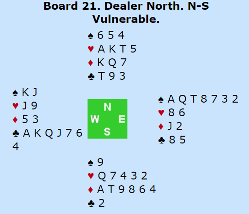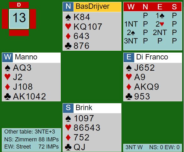 Spillet i 6 spar var etter kløver 2 i utspill over på sekunder, spillefører kunne tatt fjorten (!) stikk totalt etter å ha tatt ut trumfen. Ett doblet overstikk ga den uvanlige scoren +1310 til Danmark. Nitrist siden N/S har fire stikk i rødfargene å hente og kunne tatt tre doblede bet.