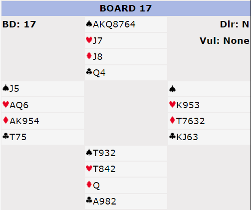 Og det var rett å melde over 5 spar og, forutsatt at man ikke finner utspillet mot den kontrakten. Men å melde slem N/S er feil i teorien siden 5 spar er to bet og 6 ruter/hjerter en bet. Så ble det noen sekunder plutselig rett å melde 6 ruter, for N/S fikk på en måte motparten dit de ville da Ø/V gikk i 6 spar. Men det utviklet det seg til et skikkelig katastrofespill når utspillet ikke ble funnet mot 6 spar.