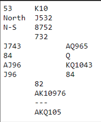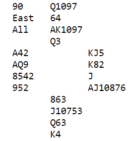 N/S vinner enkelt 5 hjerter, men ikke 6 hjerter om vest spiller ut spar. Vel, det står faktisk i 6 hjerter, men da må nord være spillefører! I så fall er spar konge beskyttet. Om øst mot hjerterkontrakt spilt av nord ikke tar for spar ess blir det tretten stikk. Nord sine to spar kan kastes på kløveren. Følgelig er maksimalscore i teorien +1430 til N/S (6S spilt av nord). Så "par", dvs. det som er maks på spillet om alle gjør det riktige som ikke er så lett med slikt uten å vite kortene, er +500 til N/S, for Ø/V kan stampe helt opp til 6 spar hvor det kun er tre doblede bet. Teori og praksis er imidlertid to forskjellige ting...