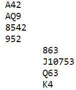 Nord er giver, N/S i sonen. Dette er syd sine kort: