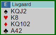 Øst, Livgård (Viking Club) åpnet med 1 ruter. Syd (Ekren) gikk innpå med 1 hjerter, og Terje Aa (vest) støttet til 2 ruter. Nå støttet Berset (nord) til 2 hjerter, men det fungerte ikke helt etter hensikten da det fikk øst til å tvile på om grandkontrakt var riktig med kun en hjerterstopper, og det var det grunn til å tvile på. Han doblet for å vise gode kort (opplysende), og syd sa 3 hjerter, pass, pass tilbake til øst. Livgård tenkte at noen ganger må man bare gi seg og lot N/S spille delkontrakten. Slik så hele spillet ut: