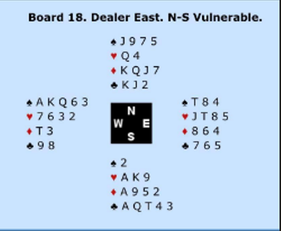 Ved det andre bordet åpnet øst med 1 sterk kløver. N/S var med, og Ø/V havnet til slutt i 3NT. De har tross alt 24 HP og en god langfarge som gir stikk, og man har gjort dummere ting enn å prøve seg på soneutgang med det! Men her var det ikke tingen. Etter hjerter ut til damen og kongen var det med disse kortene kun seks toppstikk. Så snart N/S kom inn hadde de fem hjerterstikk og to ess, tre bet. Det ga +300 til VIKING CLUB, 8 IMP ut for lag EKREN, IMP de godt kunne tenkt seg å ikke tape i denne turneringens fotofinish.