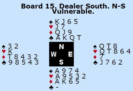 Ruterutspillet var ingen suksess. Nå hadde spillefører ingen problemer. Han vant ruterutspillet hos nord, trumfet kløver 10 og spilte spar ess fulgt av spar til finesse. Øst fikk trumfstikket sitt, men det var det eneste Ø/V fikk da en hjerter senere forsvant fra nord på syds fjerde ruter. NICKELL +1430.