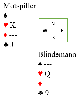 Han måtte kaste kløver knekt eller hjerter konge. Hvis man ikke har fulgt med og ikke har tellinga er det ofte slik at det visuelle avgjør. Han ser altså hjerter dame på bordet og glemmer resten. Så han holder på hjerterkongen og kaster kløver knekt. Men idet den femte sparen ble spilt satt altså nord med: