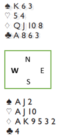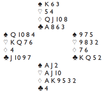 Dette er et slikt spill idet det meldes, men her er det en bra slem. Hvis frykten for å passere 3NT er for stor ender det der. Hvis syd gir en sleminvitt blir det ruterkontrakt, og slik kortene er vil det være godt sjanser i 6 ruter.
