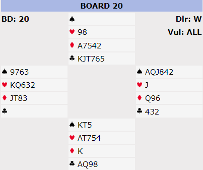 Lett å se at her var det aksjon i utide, for med de svakeste kortene og elendig tilpasning var Øst sjanseløs der han var tvunget til å preferere i makkers farger. Utspillet gikk til esset hos Terje, og sp 2 opp igjen vant jeg med esset før hj K ble tatt og så tok jeg for ru A og fortsatte med liten ruter der kongen i bordet vant. Øst stjal ru 3 der Solli kvittet seg med en liten spar. Hj D gikk så til sak av ruter og Treje fikk for sin minste trumf og returnerte kl 7 til mitt ess. Situasjonen var helt avklart og med hjerter opp fra meg i neste stikk var Nord nødt til å få stikk for de tre trumfene han satt igjen med. -5 ga oss 1100 inn, men det var en annen som i 4 ruter og 3 kløver hadde gått ennå en bet doblet. Likevel 20-4 i score og dermed var vi ajour med middels pluss! Siste runde ble første spill ren bunn der vi ble doblet i 4 hjerter med en bet i sonen mens siste ga oss topp i 2 NT doblet av motparten og vi kunne innkassere de 10 første stikkene, 5 i spar og 5 i hjerter. Sterke i minor, ikke hold i major! Fasit pluss på en dårlig dag men fornøyd med det og morsom spilling de 14 spillene vi gjennomførte.
