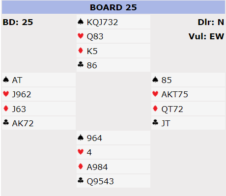 Ierje åpnet med 1 hjerter og etter pass fra Syd svarte jeg 1 spar og etter pass fra Nord støttet Terje med 2 spar som jeg høynet til 4 spar. Det kjøpte kontrakten. Nord startet med sp 2 som fikk løpe til min knekt over 7.eren fra Nord. Det så ut til å være et vrient spill og 10 stikk var ikke opplagt. Men det skal spilles, og jeg ville prøve< å utnytte trumfen min. Derfor hj K og ny hjerter til esset fulgt av hjerter 6 der Syd sakte en kløver og jeg kunne vinne med sp 2. Så fulgte ruter til esset og nok en hjerter der Syd påny sakte kløver og jeg vant med sp 4. Nå kunne jeg ta for ru K, spille ruter til røff med sp 10 og deretter kjøre hj 10 som sto til stjeling med sp A. 10. stikk fikk jeg på sp K. Mine 7 trumfer gav dermed 6 stikk!