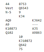 Nord og Syd passer mens Øst åpner i 2 kløver i 3. hånd. Vest har fin fordeling med 6 hp og hvis man ikke bruker avventende 2 ruter- svar er det ikke unaturlig å strekke seg til positive 2 hjerter selv om 6 hp kanskje er vel hardt. Over 2 hjerter kan Øst da svare 2 NT med sine 21 hp og semijevn hånd. Da blir det for hardt for Vest å vise sin andre langfarge og løft til 3 NT dermed mest sannsynlig bud. Av 16 bord kom 8 i 3 NT, alle av Øst. Det skal med aktuell sits ende opp med 11 stikk siden Syd får for hj A ‘og K. Ved de andre bordene ble kontrakten spilt i ruter, men3+3 på Vest sin hånd. Der kan man dedusere at Vest har svart 2 ruter på makkers kravåpning. Men av de 18 bordene i ruterkontrakt kom 9 i vanlig utgang mens de 9 siste spilte 6 ruter. Der har nok Øst i 2. runde vist sin lengste farge, 3 ruter, og Vest enten meldt 3 hjerter (5+ og 4+ hp hvis naturlig) eller støttet direkte med 4 ruter. Bruker man dobbelt avslag kan 3 hjerter (mulig 0-3 hp) bli besvart med 3 NT av Øst der Vest så naturlig kan invitere til utgang+ med 4 ruter. Da går Øst på med 4/5 ess Blackwood og lilleslem som er flott kontrakt kan nås. Alle lokale lag i A- puljen nådde den utapelige slemen.
