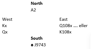 Det er hvis det sitter 4-2 det er interessant. Du spiller esset og begge følger med småkort. Så en spar til mot hånden. Åtteren kommer på.