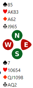Her er det drømmetilpasning, og selv om N/S har kun 21 HP til sammen og bare en 4-4 tilpasning i hjerter er 4 hjerter en god utgang. Om det sitter surt kan den gå bet, men det er veldig bra sjanser.