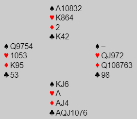 Fra vest kom hjerter knekt i utspill, og hele spillet så slik ut: