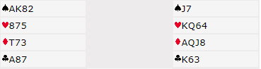 Nord åpner med 1 kløver og syd sier 1 hjerter, naturlig. Nord høyner til 2 hjerter før syd går i 4 hjerter. Utspill?