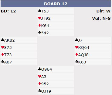 Der åpningsmeldingen var 1 kløver valgte lag KIPPE sin vest ruter 5 i utspill. Ved det andre bordet hvor beste minor 1 ruter var åpningen valgte HAUGE sin vest spar 4 i utspill. En kan vel si at utfallet av slikt ofte er litt tilfeldig. Og denne gangen varf det slik at om spar 10 og ruter 10 bytter plass i dette spillet ville ruter ut vært best, men slik det så ut var sparutspillet bedre.