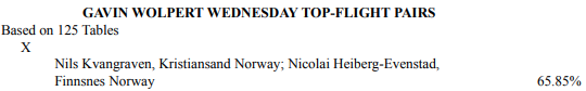 Ø/V fant et bra motspill mot 2 kløver doblet. Det kom ruter ess i utspill, ruter til kongen og ruter til stjeling med vests single trumf. Øst fikk også en stjeling da vest spilte spar ess og mer spar, og øst måtte få to trumfstikk til. Så det ble to doblede bet, Ø/V +300. Men det var ikke nok.