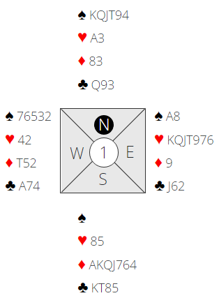 Hjerter konge spilles ut mot 4 spar. Øst stikker med trumfesset i første trumfrunde og tar hjerterstikket. Så skiftes til ruter! Nå blir spillefører låst på bordet (syd) og får ikke tatt ut trumfen. Om han prøver seg med liten kløver mot damen fyker vest opp med esset - forsvarets tredje stikk - og øst får seg en stjeling idet vest spiller ruter. En bet etter glimrende motspill!