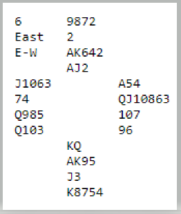 Øst spilte etter min mening temmelig uforståelig ut sin single ruter. Det kunne kanskje blitt bet likevel, men siden vest, kanskje litt i panikk prøvde hjerteren fra topp da han kom inn på spar ess (husk vest så ikke nord sine kort) godspilte han nords fjerde hjerter – det niende stikket. Pluss +550 til lag ASHTON sammen med +500 ved det andre bordet ga 14 deilige IMP på veien mot seier i finalen.